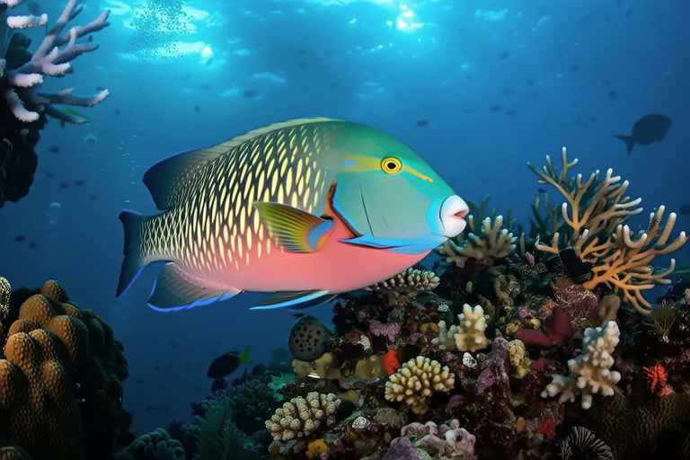 Parrot fish are herbivorous, feeding primarily on algae that grow on coral surfaces. By grazing on these algae, they prevent overgrowth, which can otherwise smother corals and inhibit their ability to photosynthesize. Their diet consists mainly of filamentous and fleshy macroalgae, which they consume using their strong jaws and teeth. The fish’s feeding behavior not only helps maintain the balance between algae and corals but also plays a vital role in promoting coral growth.